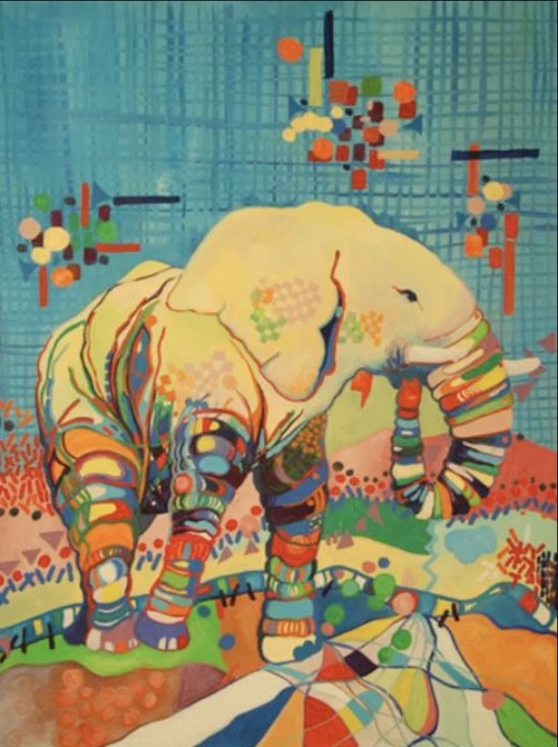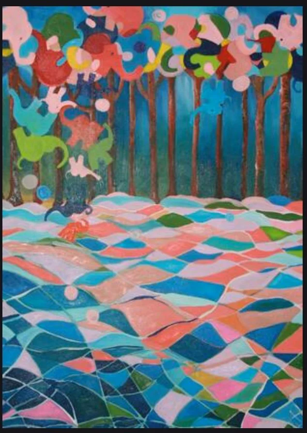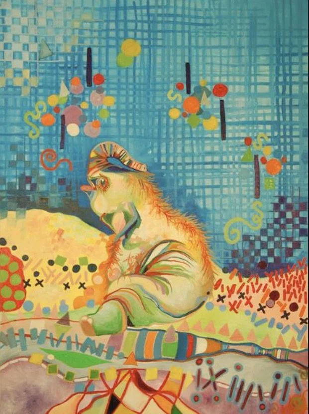 This untitled series of four paintings fits horizontally together and illustrates elements of motherhood. The series is currently in storage as panel three was damaged. Repairs would need to be made for any interested parties. The set will sell for $12,000 and each panel is 3 x 4 feet, oil on canvas.